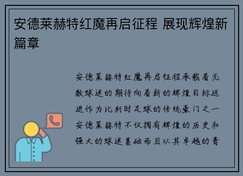 安德莱赫特红魔再启征程 展现辉煌新篇章