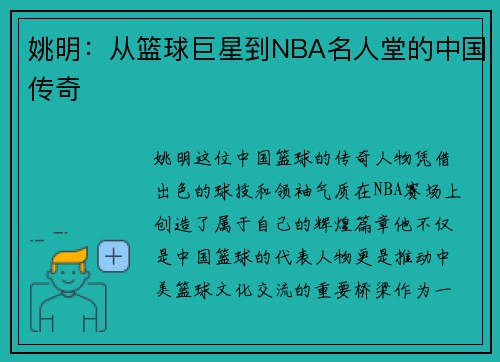 姚明:从篮球巨星到NBA名人堂的中国传奇