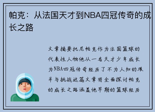 帕克:从法国天才到NBA四冠传奇的成长之路