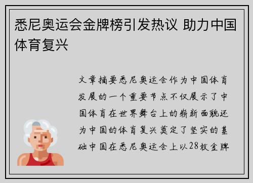 悉尼奥运会金牌榜引发热议 助力中国体育复兴